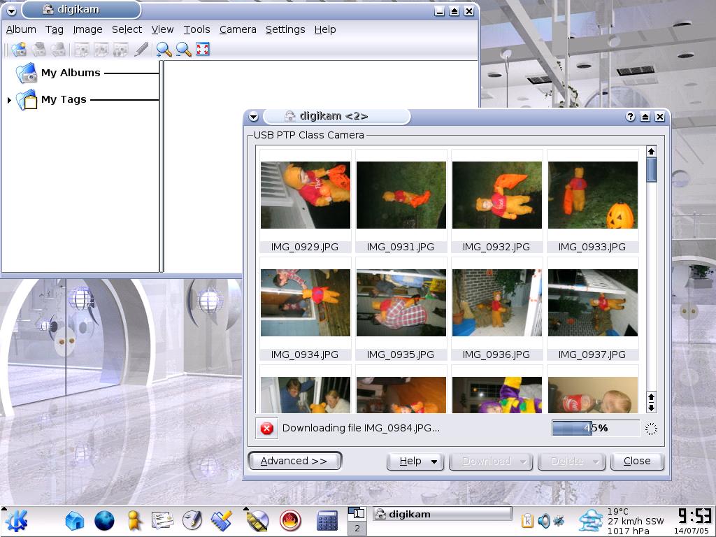 digiKam is a simple digital photo management application for KDE, which makes importing and organizing digital photos a "snap". The photos can be organized in albums which can be sorted chronologically, by directory layout or by custom collections. An easy to use interface is provided that enables you to connect to your camera and preview, download and/or delete your images.