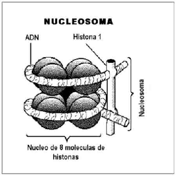 Son unidades repetitivas formadas por un octámero de histonas (H2A, H2B, H3 y H4, dos de cada una), a manera de esferas aplanadas de 10 NM, alrededor del cual se arrolla una porción de ADN de 140 pares de bases en dos vueltas y sellados por fuera con la H1 en correspondencia con 60 pares de bases más, que actúan como un puente a otros núcleosomas. Esto hace que a la microscopía electrónica, por la digestión de ácidos débiles(se desprende la H1)se observen una estructura semejante a cuentas de un collar.