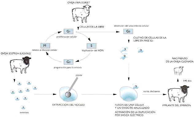 En los años 70, Gurdon logró colecciones de ranas idénticas a base de insertar núcleos de células de fases larvarias tempranas en ovocitos (óvulos) a los que se había despojado de sus correspondientes núcleos. Pero el experimento fracasa si se usan como donadoras células de ranas adultas. Desde hace unos años se vienen obteniendo mamíferos clónicos, pero sólo a partir de células embrionarias muy tempranas, debido a que aún no han entrado en diferenciación (a esta propiedad se la suele llamar totipotencia). No es extraño pues el revuelo científico cuando el equipo de Ian Wilmut, del Instituto Roslin de Edimburgo comunicó que habían logrado una oveja por clonación a partir de una célula diferenciada de un adulto. Esencialmente el método (que aún presenta una alta tasa de fracasos) consiste en obtener un óvulo de oveja, eliminarle su núcleo, sustituirlo por un núcleo de célula de oveja adulta (en este caso, de las mamas), e implantarlo en una tercera oveja que sirve como "madre de alquiler" para llevar el embarazo. Así pues, Dolly carece de padre y es el producto de tres "madres": la donadora del óvulo contribuye con el citoplasma (que contiene, además mitocondrias que llevan un poco de material genético), la donadora del núcleo (que es la que aporta la inmensa mayoría del ADN), y la que parió, que genéticamente no aporta nada.