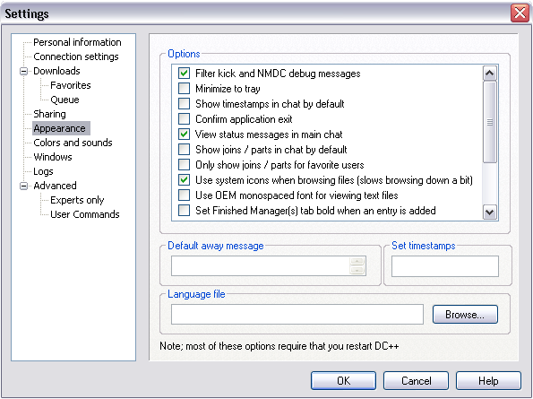 "Default away message", "Set timestamps", and "Language file" can be left untouched as I am willing to bet you will never use them.