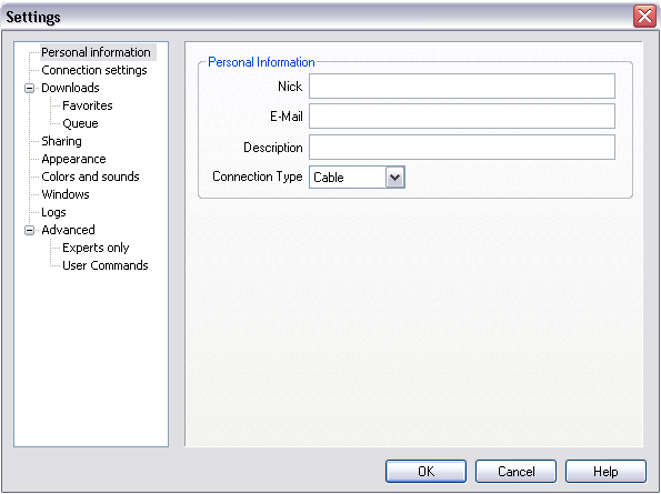 1. The first screen displayed in the settings box is for personal information. Choose a nickname and select your connection type. You can leave the e-mail and description fields blank unless you feel like receiving spam or listing what's in your share.