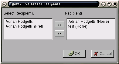 When you have added the required recipient/s click on the "OK" button. The recipients will then appear in the gefax main window along with the fax numbers as shown below. Clicking the "Cancel" button will dismiss the dialog without adding any recipents.