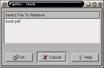 To retrieve a file/s, click on the "Retrieve A File From Trash" button located on the main toolbar, or, Selecting "Trash->Retrieve From Trash" from the menu bar. The gefax - Trash dialog will appear as shown below.