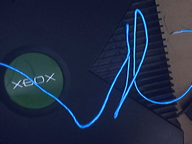 EL wire goes through out the whole thing. It even surrounds the bottom and lights up the underneath of the Xbox all blue.