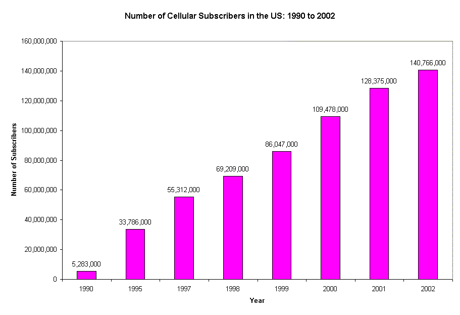 Looking at chart 1, according to the Cellular Telecommunications and Internet Association's semiannual wireless survey, for the years between 1990 and 1995, a five year period, there was a 12% increase in subscribers. For the period between 1995 to 1997, only two years, there is also a 12% increase. When we look at the time period of 1997 to 2002, the increase in subscribers is now 12% each year! In the year 2002, there were over 140 million cellular subscribers plugging cellular telephones into the national grid for the purpose of recharging their cellular telephones. This supports the fact that this new technology is partially responsible for the added strain on an antiquated power delivery system.