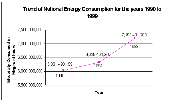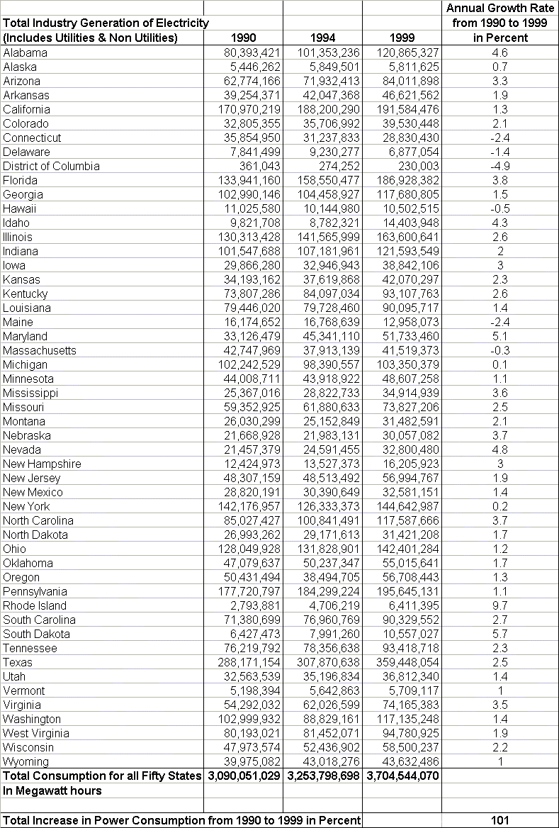Consulting the Energy Information Administration, which provides raw statistical data for energy consumption in the U. S., provided some alarming statistics. Referring to figure 1 in the appendix I compiled a chart of data showing the percent increases and decreases for each of the fifty states for the years 1990 through 1999. At a glance, it doesn’t appear all that alarming. Most states show minor increases of power usage except such states as Rhode Island who experienced a 9.7% increase in power consumption. For the most part it appears to be a 2% increase. If that’s what you think, then you missed the point. That’s 2% per state. But there are 50 states. What do you get when you multiply 2 x 50? Interestingly enough with all the fluctuations across the states it works out to be a whopping 101% increase in power consumption over 9 years.