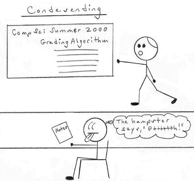 When a professor comes up with a "Grading Algorithm" and cannot adhere to conventional methods for a student to monitor their progress in the class, you know it's time to run! This only illustrates that he's a pompous ass. If you can't use the age old method of an A=90 and above, B+ is 86-89, B is 80-85, C+ is 76-79, C=70-75, D=65-69, and F is anything below 65, the conventions established by UMBC, and that you don't simply add up your grades and divide by the number of grades you received to keep track of your own progress, you KNOW you're in the wrong place!
