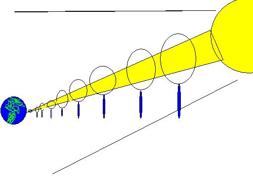 | Now then, you begin this experiment by having at least ten giant magnifying glasses, each smaller than the last. Then place the single biggest glass directly in front of the sun(you could use a different star, but the closest alternative is alpha centauri, and you'd need more magnifying glasses). Then place the next size down if front of the first one, then the next one, etc. until they reach the earth. |