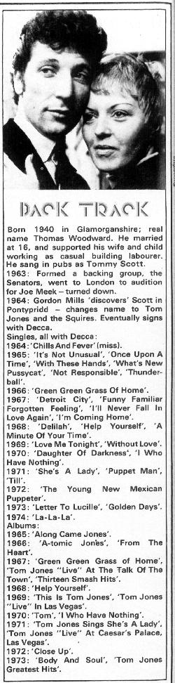 It's ironic that Tom Jones' career should have begun with an appearance on British television's Ready Steady Go!, for he was the anthesis of everything the program represented to most of its viewers. By 1965 Ready Stady Go! was at its speak, and for countless kids the weeken really did start there. School and work were over, and while the dried their hair, pressed their clothes, and checked out their new shoes ont latest dance steps, they'd keep on eye on the TV screen to make sure the wren't shaping their hair into last week's style, wearing last week's colour, or tracing out last week's dance in the wrong shoes. Ready Steady Go! Belonged to the Mods. So what was Tom Jones doing up there on a tiny stage surrounded by these snappy kids who wanted to see Georgie Fame or the Who? Mods were neat, mostly tiny it seemed, and very cool. Jones was a hefty brune who threw himself about and worked up a sweat that stained his shirt. He must've disliked the kids just about as much as they loathed him: a great voice it entered the charts, "It's Not Unusual" was at no.1. Tom Jones' success with that song at that time is indicative of two things: the decline of the record buying public's interest in groups, and his manager's sharpness in spotting this trend. In 1964 only three solo performers had made no.1 in the British charts: Cilla Black (twice), Roy Orbison (three times) and Sandie Shaw (once). The top 20 was dominated by groups, 13 of which topped the charts at least once. 1965, though, was different. In April, Cliff Richard returned to the top for the first tin over two years, to be followed by singers such as Roger Miller, Jackie Trent, Sandie Shaw, Elvis Presley, Ken Dodd, Sonny and Cher, the Seekers, and even the Walker Brothers . . . all emphasising the enormous changes from only the year before. The Beatles, and the group boom of the early '60s, had wrecked the careers - or at least broken the chart success - of most of Britain's male the Top 20 three times after 1962, Mark Wynter twice, Eden Kane once, and Marty Wilde, Craig Douglas, Lonnie donegan, Jimmy Justice, John Leyton had no further hits. Only Cliff Richard survived and, for another three years, Billy Fury. So once the public's overwhelming infatuation with groups had sybsided, there wasn't much is where Gordon Mills comes in, Tom Jones. Jones had been around for a long time - in Wales, that is. Born in Treforest, Glamorganshire, in 1940, he was still hanging out in pubs drinking under age when rock & roll hit the valleys in 1956. His "career" started with bar-room singing - and enough brawling to break his nose a few times - and he'd give everything that was popular frim the big throat - first for beer, then pound notes. Since Welshmen, especially in groups, probably make up the greatest nation of amateur fingers in the world, Jones must have had something powerful going for him to get the rest of the boozers to shut up enough to join in at the right places, if not just listen. At that time he was calling himself Tommy Scott. Tommy was real enough, but Scott was just what he figured to be a good name for a rock & roller. Not that his real name was Jones - like half the families in his street it was Woodward. The Jones bit came later, an invention of Gordon Mills (who subsequently transformed Gerry Dorsey into Englebert Humperdinck), and it wasn't chosen to go down well with the folks back home, but to exploit the enormous success of the film of the same name. Scott, however, was stuck in Pontipridd bars and working mens' clubs until long after rock & roll died. He sang on through the early '60s - switching from the Top 10 to old rockers, and then to even older songs. In those days though, neither his repertoire, his voice, nor the extravagant movements he began to jerk and bump together, were enough to make him a living - especially with the wife and kid he'd had with him since he was 16. So he worked as a casual labourer during the day, and later when he was a star and people said he looked more like a hod-carrier than anything else, that was the reason why...hewas a hod-carrier. When the groups broke out of Liverpool in 1963, and every town with more than three strummers and fourth inhabitant who could keep, time threw up its own pop group, it didn't make a whole lot of different to Tom's music. All he did was pull a few locals together to back him, and carry right on singing the way he always had done. He knew it made one difference, though: it made it harder to sell himsel outside his home town - and that was the only way he was ever going to make it. At first, the A&R men that saw Jones didn't display the same foresight as Mills had done. The wanted groups, and Tom Jones and the Squires didn't count. Besides this his image was all wrong size and shape: 'It's not that Idon't like his voice, it's just that . . . Next please.' Eventually, however, Mills managed to get him a contract with Decca. Jones recroded 'Chills and Fever', it was released as his first single, and it bombed. During this period Jones stayed by running up Mills' overdraft and making demos. Naturally he made demos of Mills' own songs, so when Mills wrote 'It's Not Unusual' with Les Reed - hoping to place it with an already established female singer and thus stand a good chance of making it a hit - Tom sang it for the demo. His instant liking for the song was clear in the way he performed it. All a demo requires is competence, and after that it's the song that's being sold - not the singer - but Tom wanted 'It's Not Unusual' for himself, wanted it bad, and got it. The first no. 1 by a new singer is often described as a surprise hit, especially when the singer has no form at all. The term, though, is often a cover-up for the promotors who neglected to plug it, the journalists who didn't review it, and the DJs who didn't get around to playing it. In fact, 'It's Not Unusual' wasn't any kind of a surprise hit. It had a strong melody, a neat catch-phrase, and an exh