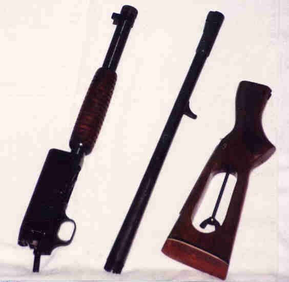 The Model 37 Ithaca made the grade. The barrel was shortened to 17.5" with .75"trued concentric with the bore. A sleeve 3"x 0.950" long sweated to the end of the barrel to incorporate a screw-in choke. Total barrel and pack length 19.75". Weight is 6 lbs-2oz. This is a formidable defense weapon with a six round capacity.