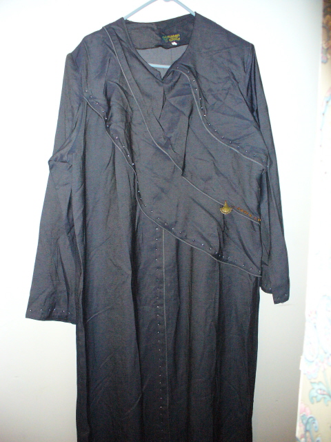 Description: Navy Jeans Jilbab with a layered look along the front. Jeans material is light weight. Imported.