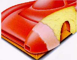 The design principle of a sandwich composite is based on an I-beam, which is an efficient structural shape because as much as possible of the material is placed in the flanges situated farthest from the center of bending or neutral axis. Only enough material is left in the connecting web to make the flanges act in concert and to resist shear and buckling loads. In a sandwich, the faces take the place of the flanges and the core takes the place of the web. The difference is that the core of a sandwich is of a different material from the faces and it is spread out as a continuous support for the faces rather than concentrated in narrow web. The faces act together to form an efficient stress couple or resisting moment counteracting the external bending moment. The core resists shear and stabilize the faces against buckling or wrinkling. The bond between the faces and the core must be strong enough to resist the shear and tensile stresses set up between them. The adhesive that bonds the faces to the core is of critical importance. |