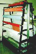 The continuous fiber creels are usually the first station on a process line. Directly after the roving creels is a creel designed to accommodate rolls of mat, fabric, or veil. The roll materials are usually supplied in diameters between 305 and 610 mm (12 and 24 in.) with cores of 75 or 100 mm (3 or 4 in. ) in inside diameter. The creel must be able to accommodate both the size of the roll and the inside diameter of the core, along with appropriate spindle spacing and core bushings. The ability to lock the position of the roll in the desired location will ensure proper delivery of the material to the desired location. In some cases, it is also necessary to provide for the pay out of web material in a vertical, rather than a horizontal, format. This requires independent stands in a "lazy Susan" type of configuration.