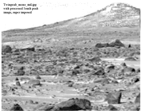 The image shown below is the South Peak as processed from an early NASA release which was later changed in all South Peak images. It was superimposed over a cropped portion of the high resolution NASA/jpl image Twinpeaks_mono_md.jpg. It is probably a more correct depiction of this region of Mars. Note the pattern and design of all the objects. Could this be the "extraordinary Proof" that would be required for the extraordinary claim of intelligent non earth origin life?