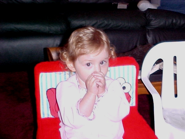 angel sitting in her elmo chair sucking her thumb in her usual way.