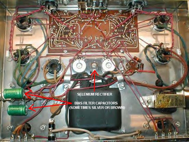 3. Bias filter capacitors: these are the two brown or silver tubular devices near the rear of the underside of the chassis. Like the molded-paper capacitors, these are known to leak current over time, and this may lead to the tubes getting damaged. Replace them with modern electrolytic capacitors of similar value (47-100µF@50-160V). Note that electrolytic capacitors have a positive side and a negative side. Many modern electrolytic capacitors have arrows pointing to the negative side of the capacitor, or a plus sign (+) near the positive side. If polarities are not noted, these capacitors could explode! For a picture of the underside of the chassis showing where the selenium rectifier and the bias filter capacitors are, click the thumbnail below.![]()