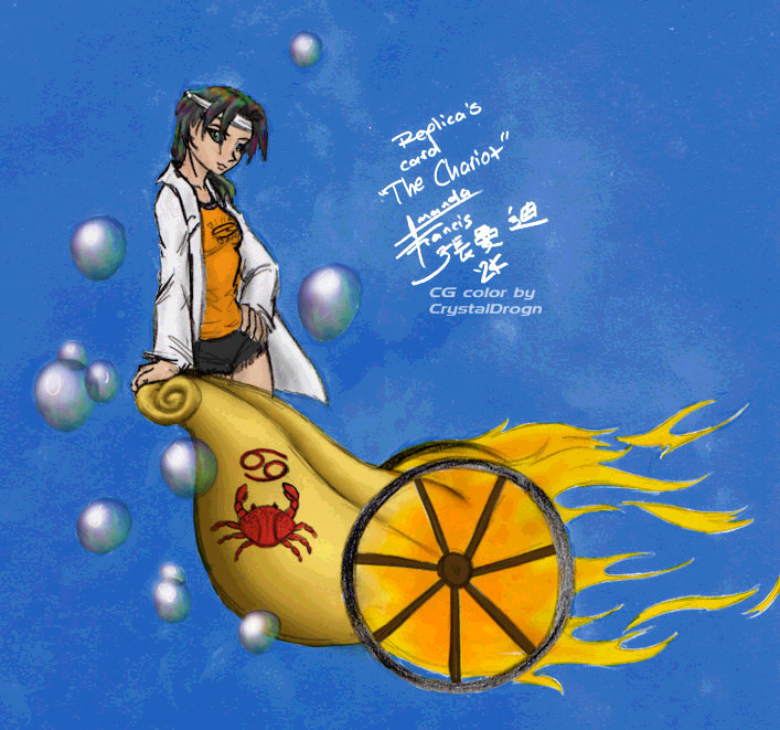 Replica posing for her Tarot card, The Chariot. Artwork by Myth.