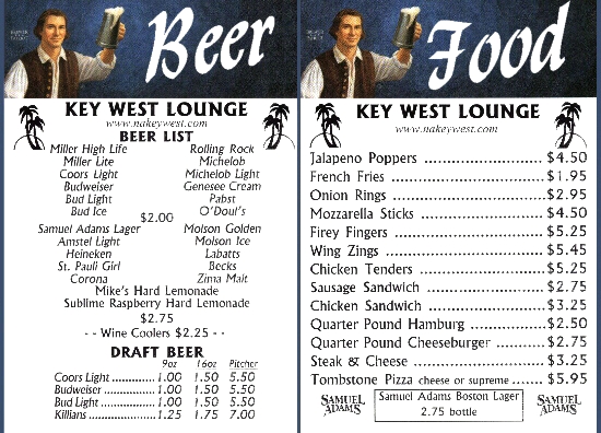 Key West Menu ... Visit our Lounge,sample the food & beverages,enjoy the entertainment,party. ...