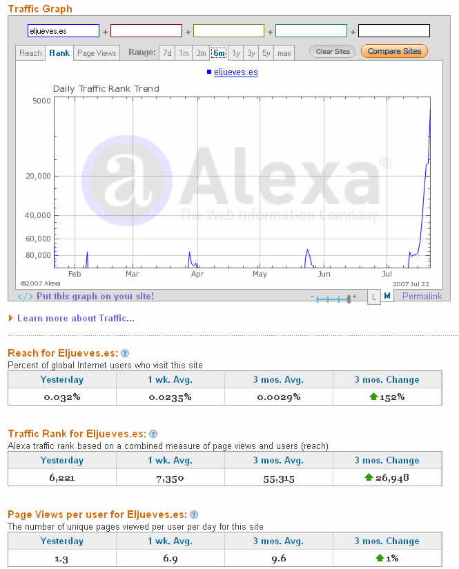 Analizando los datos provistos por Alexa(http://www.alexa.com/data/details/traffic_details?url=eljueves.es.), el "Traffic Rank" de la pagina web antes del secuestro rondaba por los 55.000. Despues del corte de la pagina web, rectificación y la reanudación posterior del servicio, el "Traffic Rank" ha saltado hasta 6.000. Alrededor de 5.000.000 hits (No es un error ortográfico, son cinco millones de hits al dia). Vaya favor que le han hecho. Un incremento igual de tráfico, para darlo un valor pecuniario, se podría conseguir en tan poco tiempo con un gasto de más de cien mil euros en Adwords. A continuación me planteo la duda: ¿Este tipo de procedimiento hecho adrede para marketing, llamémoslo marketing polémico positivo, puede ser una manera correcta de atraer tráfico a una página web? ¿Sabrán, o podrán los dueños de la revista mantener este tráfico?
