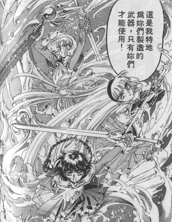 If there's any scene, fight, or character you would like to see please e-mail me!!! [This page contains manga scans from Book 2 (first blue one) that covers the series from when the Magic Knights meet Ferio through when Umi gets her mashin. Contains lots of images of all the Magic Knights, Ferio, Mokona, Presea, Clef (visions), Ascot, Alcyone, random monsters, Presea, dream-visions, armour-upgrades, Emeraude-hime, Selece, and more!]