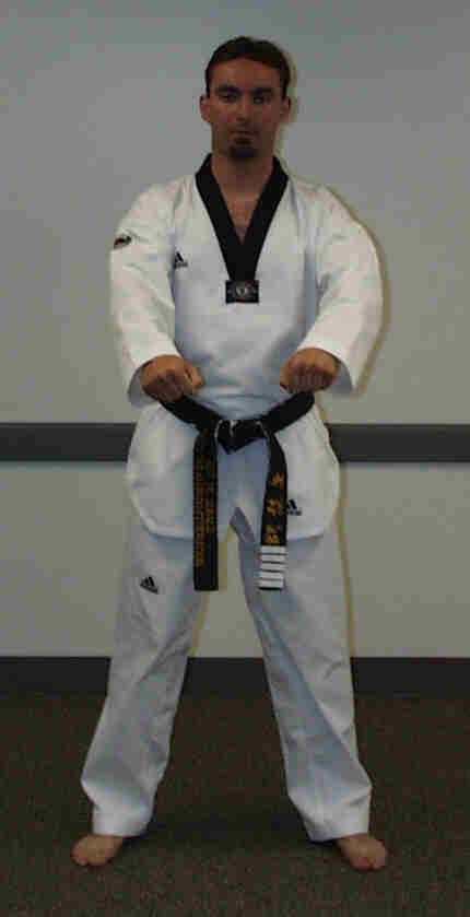 Step forward, both feet pointing straight ahead. Place both hands on your hips.