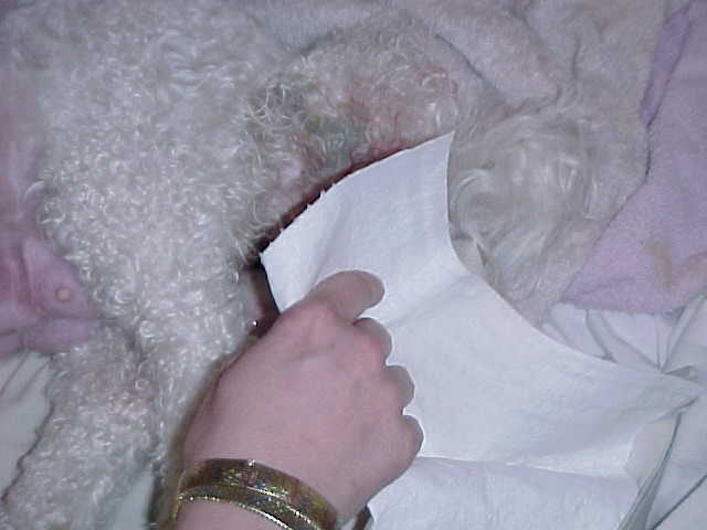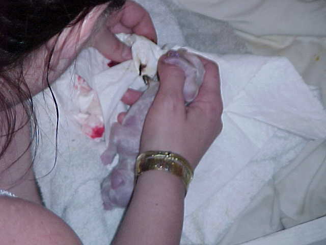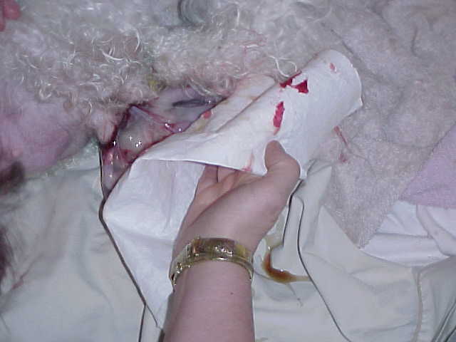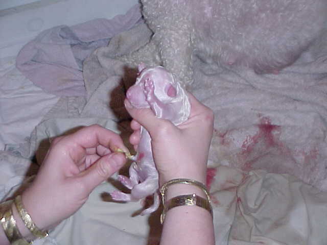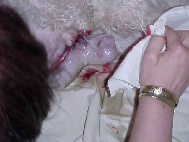 If you do not hear the puppy start to cry or move after the the membrane is removed from the puppy, this is were you can help the puppy by "gently" but briskly rubbing the puppy in a towel, holding the puppie head down to help remove any mucous from it's throat.