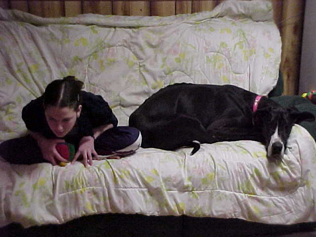 We have always let our dogs sleep on the bed with us, and when she gets on the bed at night and sleeps with Jennifer our daughter on a full size bed there is not very much room left! And the funniest thing is when she gets on the couch, which killed me! I could not stop laughing, because she took up over half of the couch as you can see by the picture.And this is a full size couch!