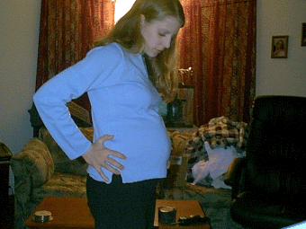This is her profile. She was opening and closing her mouth. It was so cute. This is her arm. We could see her punching me. This is her foot. This is a front view. Here is another profile view Here are some pictures of me at 6 months. Or 27 weeks. They may look a little blurry because Angelfire is screwed up. This is me at 32 weeks. Sadie Bay Smith Born January 12th 2002 at 6:36 PM. She Was 7 lbs. 13 oz. Saturday, January 12th 2002 I woke up that morning at around 9:00 with small contractions. They feel almost like menstrual cramps. They got a little worse as I started to move around so Paul called his mom and everyone and they said to go to time them and if they were 5 minutes apart then to get to the hospital. I really didn't think that I was in labor because this was the first time I had gotten contractions of any kind. I figured they were just braxton hicks contractions. After all, I had a week until my due date. Anyway, we timed them and they were between five and seven minutes apart. So, we took showers and got dressed and everything. Then we packed the rest of my bag and got the trash ready to go to the dump. All the while timing my contractions. We went to the dump and then to Wallmart to get a carseat. Cut it kinda close there. By this time I had to hold onto Paul evertime I had a contraction which were exactly five minutes apart. This was kind of embarrassing in the middle of Wallmart. Then I was hungry so we went to Papa Ginos in Webster Square to get pizza which I ate on the way to pick up Paul's mother. After we picked his mother up we went to the hospital. By now it was about 2:00 PM. I was brought to a room and hooked up to a monitor. The doctor checked me and i was 4 1/2 to 5 centimeters. I went in at 3 centimeters. So sure enough I was in labor. I didn't want the epidural at first but then as the contractions worsened I said I wanted it. That thing hurt but I felt awsome after it kicked in. I was laughing and talking with Paul's parents and sister and playing cards with my sister and Paul. When it came time to push it was a little after 6:00 PM. Paul and his mother held my hands and coached me through it. It didnt really hurt because of the epidural so it was pretty easy. I pushed for 15 minutes and out came our beautiful baby girl. I wached her come out by looking in a mirror. I can't even begin to explain how it felt when she first came out. The love you feel for this new little person is overwhelming. I just have to say it was the most awsome experiance of my life. After I had the Sadie, Paul and I stayed in a nice room. Everybody came to visit. It was nice but very tiring. We came home monday afternoon. The first night was very stressful because I had decided to breastfeed and my milk hadn't come in yet. So Sadie was hungry and wanted to nurse constantly. The nurse came the next day for the visit and said she had to go to the doctors because she lost to much weight and she had a little bit of a tempurature. So we went to the doctors and he said she didn't lose that much weight and her tempurature was fine. Thank god. But she did have a little jaundice that breastfeeding would help. My milk had just come in that morning so Sadie had just started nursing that day. It is a week later and she is doing perfectly fine. She sleeps well and barley ever cries. Except when she is naked. :) -1/19/02 This is Sadie at 4 months old This is Sadie at 7 months old I thought this picture was really cute Sadie is a really good baby. She sleeps throught the night in her crib and hardly ever cries unless she's hungry or tired. She loves to bounce up and down and babble. She can say mama and dada but she doesnt connect them with me and her daddy. She cut her first tooth yesterday. I was so excited. -9/22/02 Sadie and her mommy I found this on my friends webpage. It is a good way to condense my pictures. :) Links to Pictures Portrait of Sadie at 20 mo.