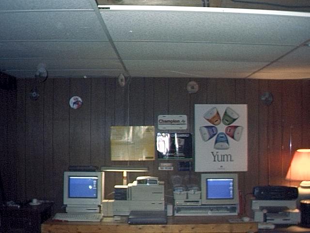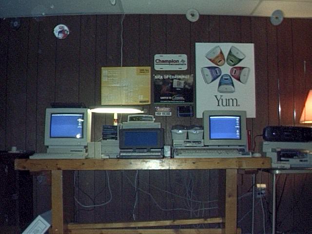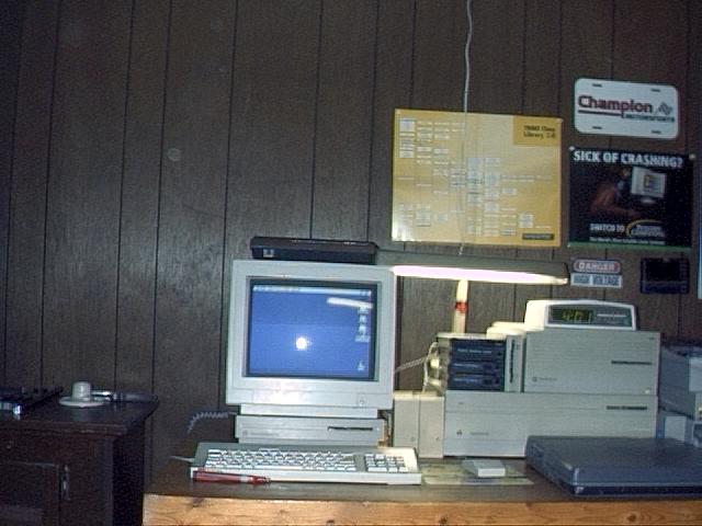 This is where I do most of my programming. These pictures show a Macintosh Performa 400, a Macintosh 2ci, and a Spark laptop with DOS 3.1