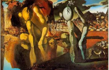 Metamórfosis de Narciso. Aquí se puede ver una mano con un huevo que crea un hombre arrodillado, también se ve un perro, un bullicio de gente detrás... puedes ver algo más? |