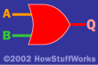 dibaca Q bersamaaan A OR B. Pemboleh ubah Y boleh bernilai 1 jika A atau B bernilai 1. Sekiranya A dan B bernilai 0, Q bernilai 0.