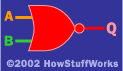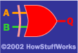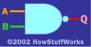 dibaca Q bersamaaan A AND B. Pemboleh ubah Q hanya boleh bernilai 1 jika A dan B bernilai 1. Pada ketika-ketika lain, Q bernilai 0.