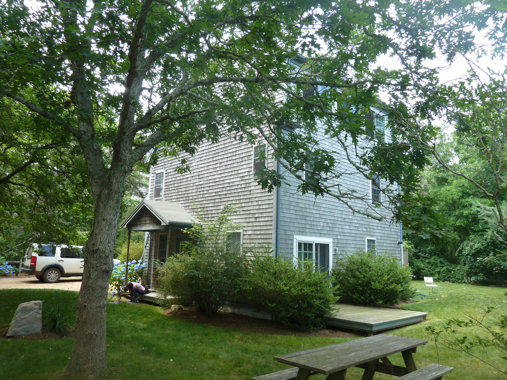 The basics: three bedroom (including a master suite on the first floor), 2.5 bath shingle style house in Ocean Heights area of Martha's Vineyard (between Edgartown and Oak Bluffs) offers some waterviews with easy walking acces to Sengekontacket Pond for watersports and beach, access to bike paths and within easy bike access to downtown Edgartown and South Beach beyond. Amenities include microwave, service for 12, dishwasher, 46" TV, DVD/blu ray player, pull out full sleeper in living room, deck, gas grill, linens, towels, washer/drier, outdoor shower, rear and side decks. Two kayaks are also available at the public landing a few minutes walk from the house. |