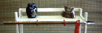 This shelf mounted "Weapons Wedge" holds bladed weapons. Sliding easily onto a book shelf, there is a deep groove which is capable of holding a variety of bladed weapons from Chinese to Japanese weapons and more. The slide above shows the "Weapons Wedge" attached to the outer lip of a shelf and holding a variety of weapons - a Katana, a Butterfly Wing Sword, a Darn Gim, and a Tanto knife. This "Weapons Wedge" will handle a variety of long bladed wapons as well as shorter weapons such as knives. Comes in Black or Red as shown above - 1 pair of Weapon Wedges - $10.00 ![]()
