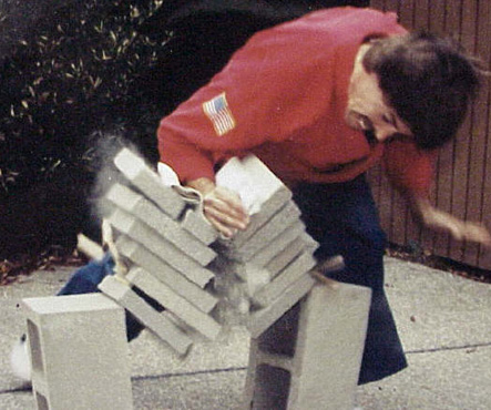 (BB1) Smashing tiles with palm.| WE NEED DEMOS ! If your martial arts school or team would like to be mentioned on this web site, all you need to do is send us demo videos and / or photos for use on this site. Right now we need brick breaking demos for this page. All your school or demo team needs to do is provide us with photos or video of your students destroying bricks that we can use on this page, and we will list you school in our online directory, and provide website and e-mail links at your request. So get that camera rolling or snapping, and send us your photos or clips now! Remember, the only way you can get listed on this site, is to participate in its creation! Its good for you, good for the site, and good for the site's visitors! Regular contributors will get special recognition! Send clips / photos here: MAIL (max 2 M for each e-mail) |