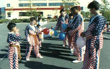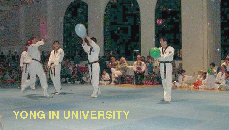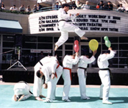 This section of the site shows various demonstrations involving the destruction of balloons. Typically, Tae Kwon Do experts break balloons as part of a demonstration. Feet are the weapon of choice for destroying balloons, but in rare cases a fist is used. Balloons are also sometimes used in training, and for testing, but are used most often as part of a demonstration. Balloon breaking is spectacular to the audience, and allows a martial artist to display the gracefulness and accuaracy, but destructive power, of his art. Balloons are also less expensive than pine breaking-boards. Sometimes balloons are filled with powder or sparkle to add to the display. When balloons are used for training or testing, they provide a specific target for the artist, while allowing the instructor to grade performance. Believe it or not, it is not that easy to kick a balloon to bits. Try it. I've seen novice practitioners try it, only to have the balloon gently float away unskaved. Trust me, it takes a very powerful and accurate kick to kill a balloon. I've seen balloons broken with reverse-spin-kicks, jumping front kicks, ax-kicks, and roundhouse kicks. You will see that in these fantastic demonstrations from Tae Kwon Do artists from all over the world... All I can say is "Bye Bye Balloons"...................