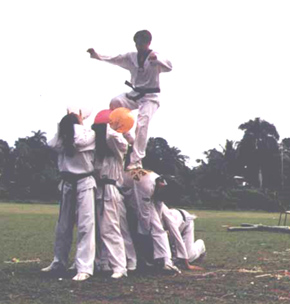 (BBB1)Breaking 2 balloons with high kicks.| WE NEED DEMOS ! If your martial arts school or team would like to be mentioned on this web site, all you need to do is send us demo videos and / or photos for use on this site. Right now we need balloon breaking demos for this page. All your school or demo team needs to do is provide us with photos or video of your students destroying balloons that we can use on this page, and we will list you school in our online directory, and provide website and e-mail links at your request. So get that camera rolling or snapping, and send us your photos or clips now! Remember, the only way you can get listed on this site, is to participate in its creation! Its good for you, good for the site, and good for the site's visitors! Regular contributors will get special recognition! Send clips / photos here: MAIL (max 2M for each e-mail) |
