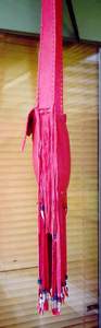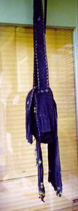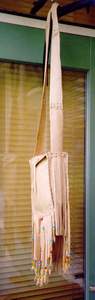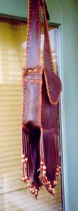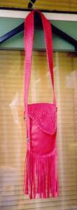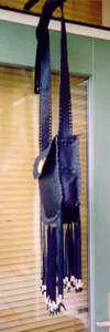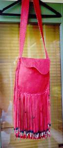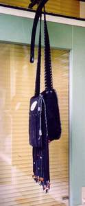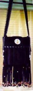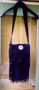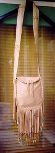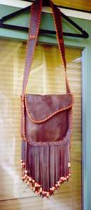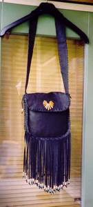 All my items are totally hand made, even the lacing is handcut and every hole is punched with love to created items that i can feel proud of. The purses shown on this page are made out of cow suede or leather, they are about 8 inch wide and 9 inch long, and 2 inch deep. Fringe can vary, straps are aprox 1.5 inch wide and long enough to wear them over your shoulder(between 35"-40" total length)Sturdy cow leather purse with huge amount of fringe/glassbeads and aluminium cones. Beads are in glossy green and fire red. Purse is 9 inch long,7 inch wide, 2.5 inch deep. Fringe at the bottom and side of 11 inch. Total length of purse is 20 inch, strap is 19 inch (38" long in total) and 2 inch wide. Black suede purse with 1 dubble row of fringe on front, large overhanging fringed flap that holds seedbead decoration.Gold fringe suede leather purse. 7 inch wide, 3 inch deep, 8 inch long 14 inch fringe,strap total is 34 inch long and 2 inch wide. Side few from purse in blue suede (same model as the black one) Purse in pink front few and side view. Brown purse western-style, the glassbeads have a wooden look, but they're soft gold.Black leather purse with double row of fringe, on each fringe pearlised glassbeads in turquoise and toffee and caramel, on flap a fan of real amber stones. Soft yellow leather purse, double row of fringe, each fringe holds glassbeads and a brass cone. Cute small pink fringe purse, with leaf shape flap If you are in for small pouches, like wearing on your neck or for holding a relic, sweetgrass, please have a look on the THIS-AND-THAT page. Mail Me Back HOME Pouches Shirts & Jackets Dresses Kid's Cradle Buckskin Must-Haves This & That Links
