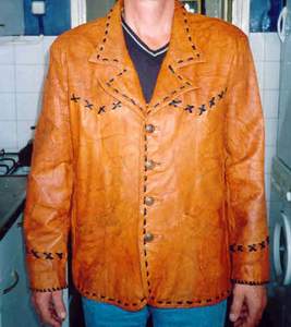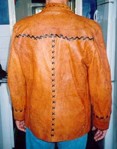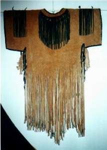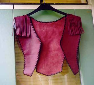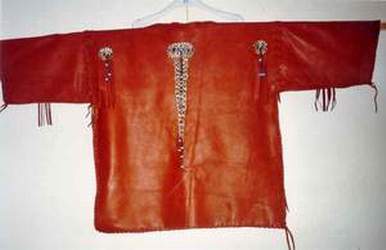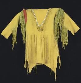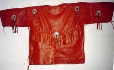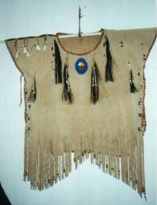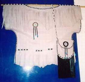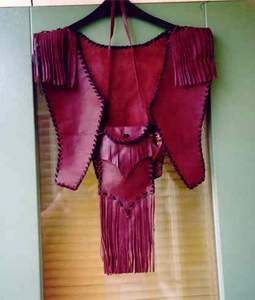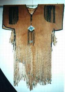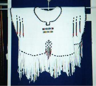 BUCKSKINBuckskin war shirt with 2 large seedbead strips and turquoise glassbeads on fringe of sleeves X-stitch lacing, rough hem, 3 raccoon tails Back hold a large seedbead roset with thunderbird and underneath the roset fringe are hanging down holding turquoise glassbeads and cones Great war shirt made of buckskin, with snakeskin adornments, fringes and glassbeads Gold shirt,long model warshirt with ultra long fringe, four wind seedbead deco on chest. front view and back view. War shirt in buckskin (short) with horse hair tassels, buffelo teeth, four wind deco in seedbeads. Deerskin lady`s shirt in white, buttery soft. Front and back view. Black deerskin jacket/blouse laced with deerskin Buckskin shirt, with rough hem.Buckskin women's shirt/top COW HIDESoft pink fringe lady`s shirt and pouch.(size 12) Lacing is done with black deerskin, Fringed yoke is 26 inch Width of shirt is 36 inch, length is 21 inch,including the fringe at the bottom of aprox 4 inch. Seedbead roset of feathers, Some glassbead deco in turquoise.Tan suede leather cape with black leather fringe and cuffs that close with velcro. Cape has satin lining and will fit up to a size 20 woman. Men's leather jacket in size large. 2 pockets in front/1 inside pocket with zip closure. Dark brown jacket/coat with bonepipes of 3 inch, copper beads and coyote face on back, long fringe in back part only. Front and back view. This is a pioneer style jacket.Leather collar with purse in deep purple/black, collar is one size fits all. Mail Me Back HOME Pouches Purses Dresses Kid's Cradle Buckskin Must-Haves This & That Links