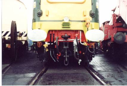 Deltic No. D9000, in three tone green livery showing buffer beam detail at Tyseley, 31/03/01.