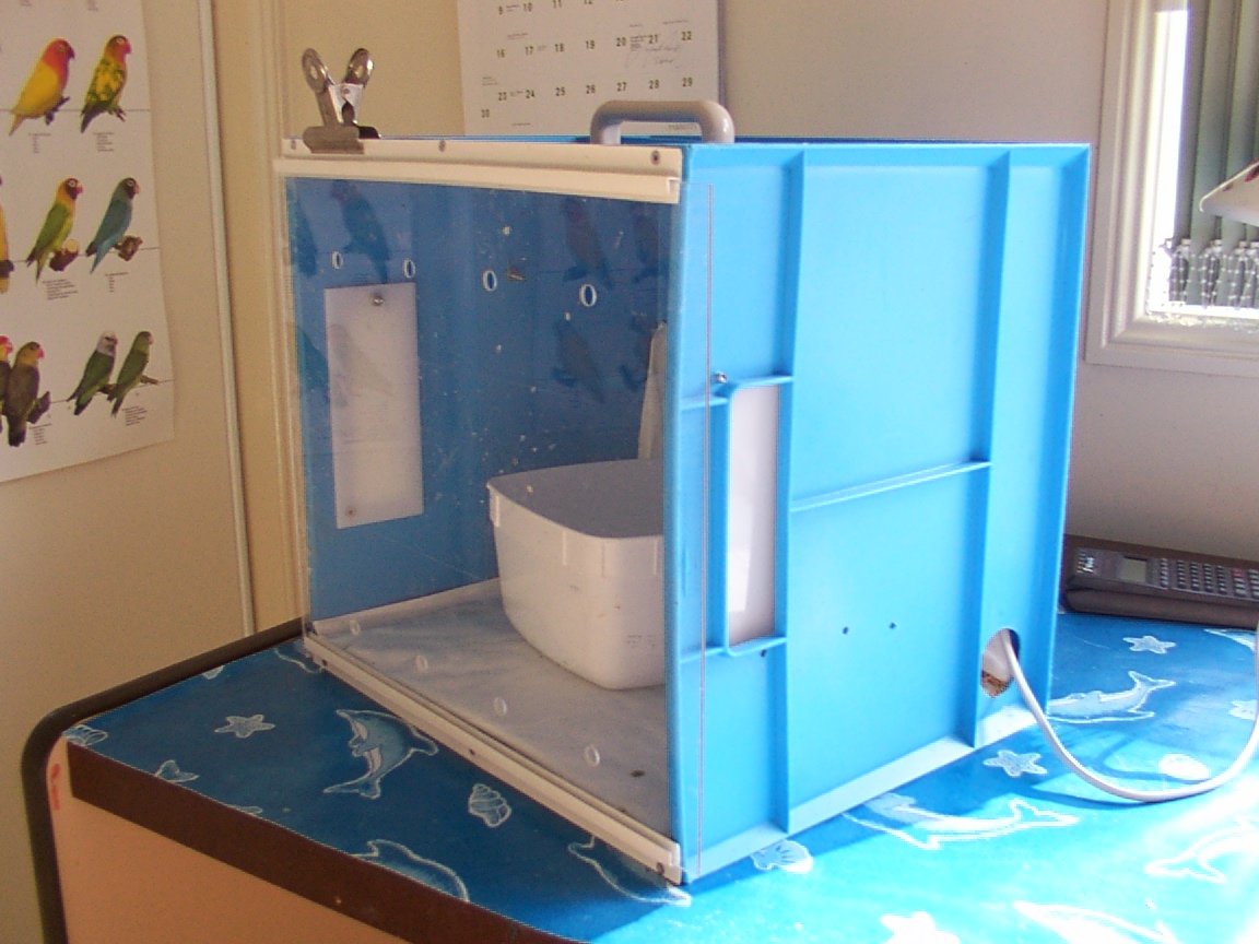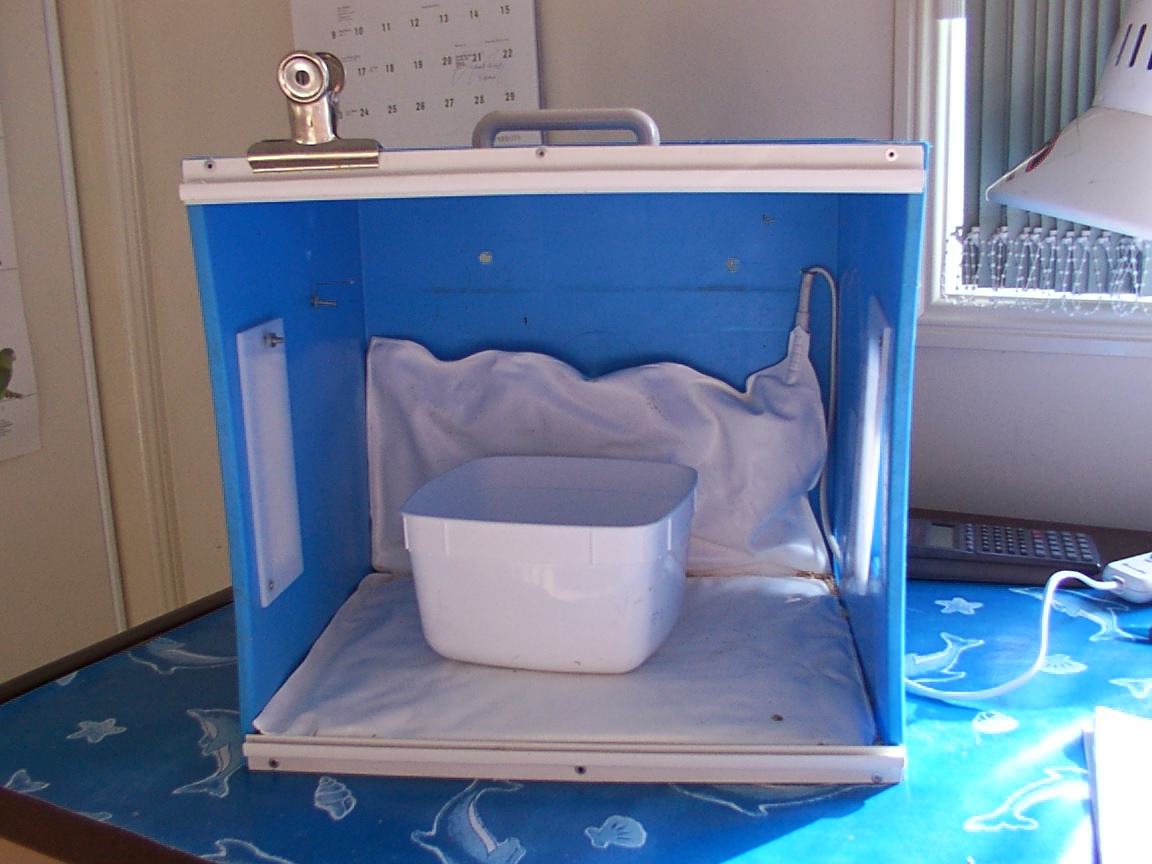 This is so the Perspex can pivot open to allow air flow and heat regulation. Step 3 Screw handle on to the top of the box Step 4 Cut Perspex to size of box, and drill 6, 12mm holes in Perspex for ventilation Step 5 Bolt hinges to the toy box and Perspex. Step 6 At the back of the toy box cut a hole large enough for a power plug to pass through. Step 7 Insert heat pad and turn on Step 8 Insert probe for the external digital thermometer, to monitor the temperature Step 9 Run heat pad for a few days to get the temperature regulated for your situation. Adjusts Perspex flaps to allow more or less air flow. Step 10 Insert birds in ice cream container and place in brooder As the bids get older and more feathers develop the Perspex flaps can be opened further to allow more air flow.
