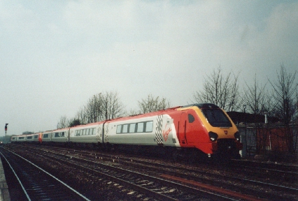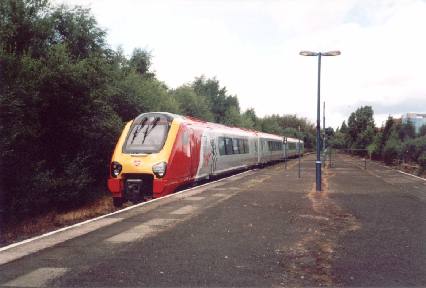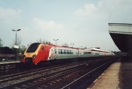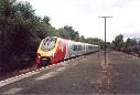 ‘Virgin Voyager’ No. 220001 departs Solihull station, 12/7/01.