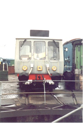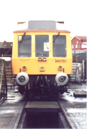 Railtrack’s Sandite Class 121 (DMU) No. 960021 showing nose detail at Tyseley, 31/03/01.