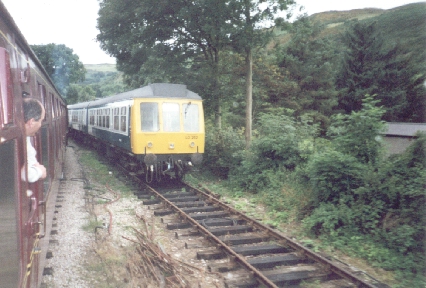 A cross country DMU in ‘blue/grey livery’ at Glyndyfrdwy station, Sept 2000 (Llangollen Railway).