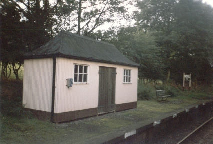 GWR corrugated iron shelter painted in western region colours at Deeside halt Llangollen Railway 7/9/97.