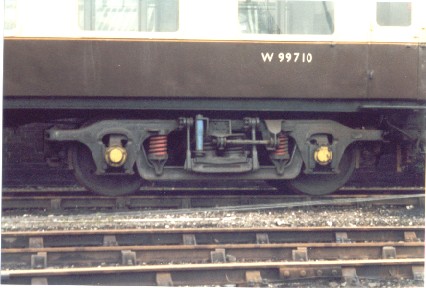 A Commonwealth bogie on a chocolate and cream liveried MK 1, No. W99710 at Tyseley, 31/03/01.