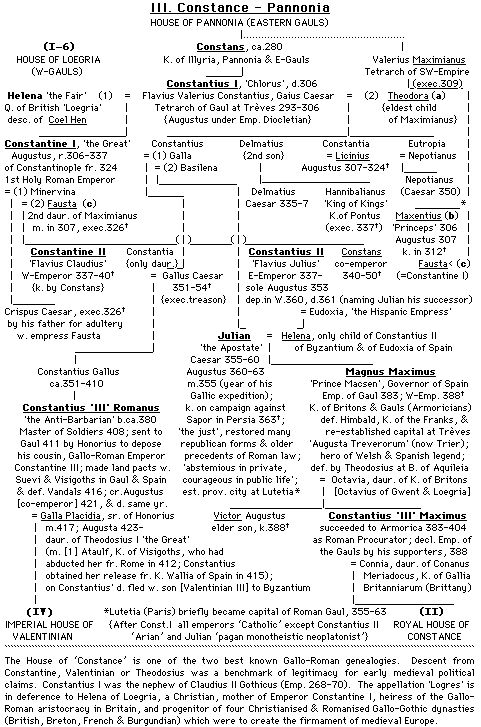 Constance- House of Constantine Pannonia Valentinian & Theodosius Goths Burgundy Merovingians- 1st House of France Carolingians- 2nd House of France |