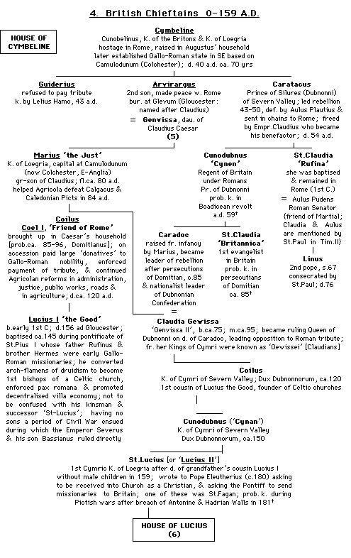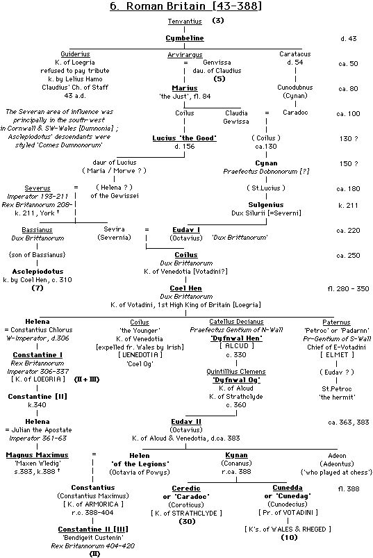 House of Malmitius House of Archmail House of Cymbeline Julio-Claudians Roman Britain (43-388) Cornwall & Dumnonia Armorica Welsh Britain (388-1509) Wales - Sons of Cunedda Wales I - Rheged & Mann Wales II - Gwynedd Wales III - Powys Wales IV - Dyfed Wales V - Gwent |