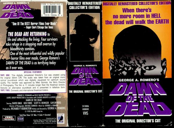 OTHER INFO: Directors Cut, digitally remastered, two VHS tapes (first with movie, second with bonus materials), additional scene of Peter pulling out a flashlight when looking down into the mall, trailers, photo montage.