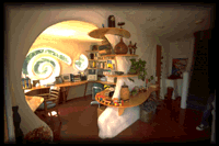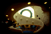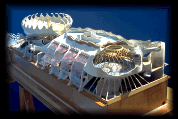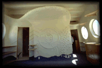 But the potential for this form of organic architecture goes far beyond Aquarius, and beyond what Marshal himself has described. Organic architecture is the first and only truly 'volumetric' architecture human beings have invented. In other words, it is an inherently three dimentional form of architecture unconstrained by the limitations of the two dimensional floor plan. Thus it is the only form of architecture we have which is truly suited to the zero-gravity environment of space. As human beings move into space, as The Millennial Project moves toward the construction of permanent space habitats, it is critical for their well-being that they be provided with a habitat they can truly be at home in. To date the environments inside spacecraft and space stations have afforded a very crude industrial vernacular architecture, an architecture whose aesthetic is defined purely by the functional engineering of the systems of transportation and survival. These habitats are not designed to be homes, are not designed to be more than temporarily comfortable, because they are not intended to be inhabitted for any great length of time or by people who are not trained to cope with severe living conditions. They are like the survival huts of arctic explorers, the bunkers of military compounds. They are purely functional, devoid of the human element in their structure even if they are designed for optimal ergonomics and therefore impossible to call home, impossible to be at home in.